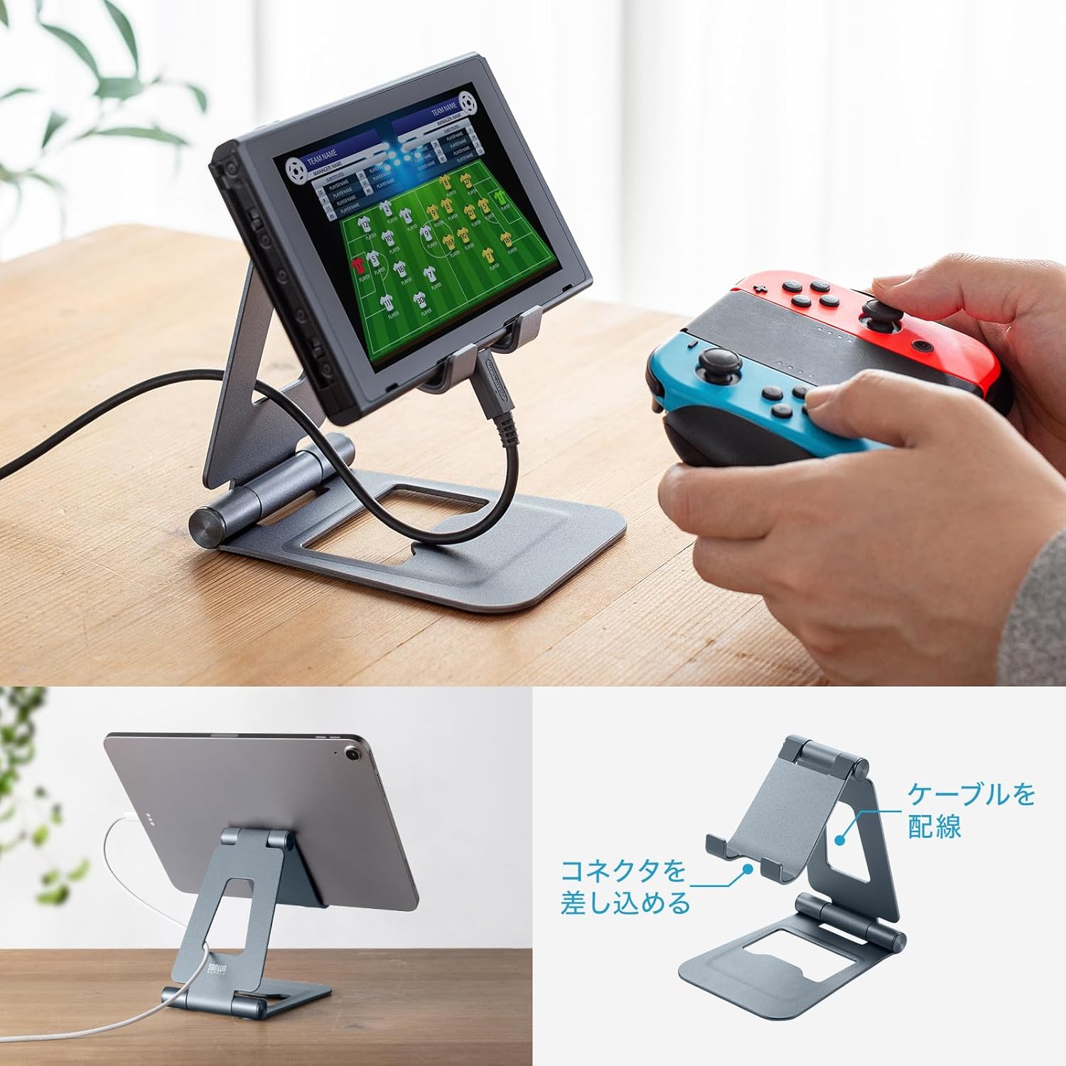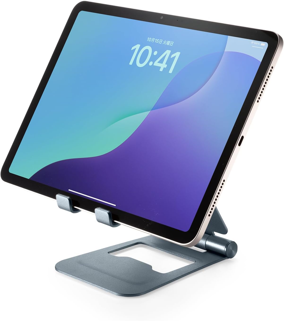 (画像はサンワサプライ公式ページより)高学年から中学初期になると、学習中のタブレットは「たまに見るもの」ではなくなります。長めの読解、学校連絡用アプリの確認、調べ学習、動画視聴などで、見続ける時間が増えます。見やすい位置を学習内容に合わせて作るには、角度だけでなく前後位置まで調整できることが重要です。 PDA-STN82GYは、2つのヒンジを搭載し、前後に位置調整できる折りたたみ式のスタンドです。ケースを付けたまま使いやすく、ケーブルホールもあるため、充電しながら置きやすい構造です。紙と端末を行き来する学習と相性が良い製品です(※9)。