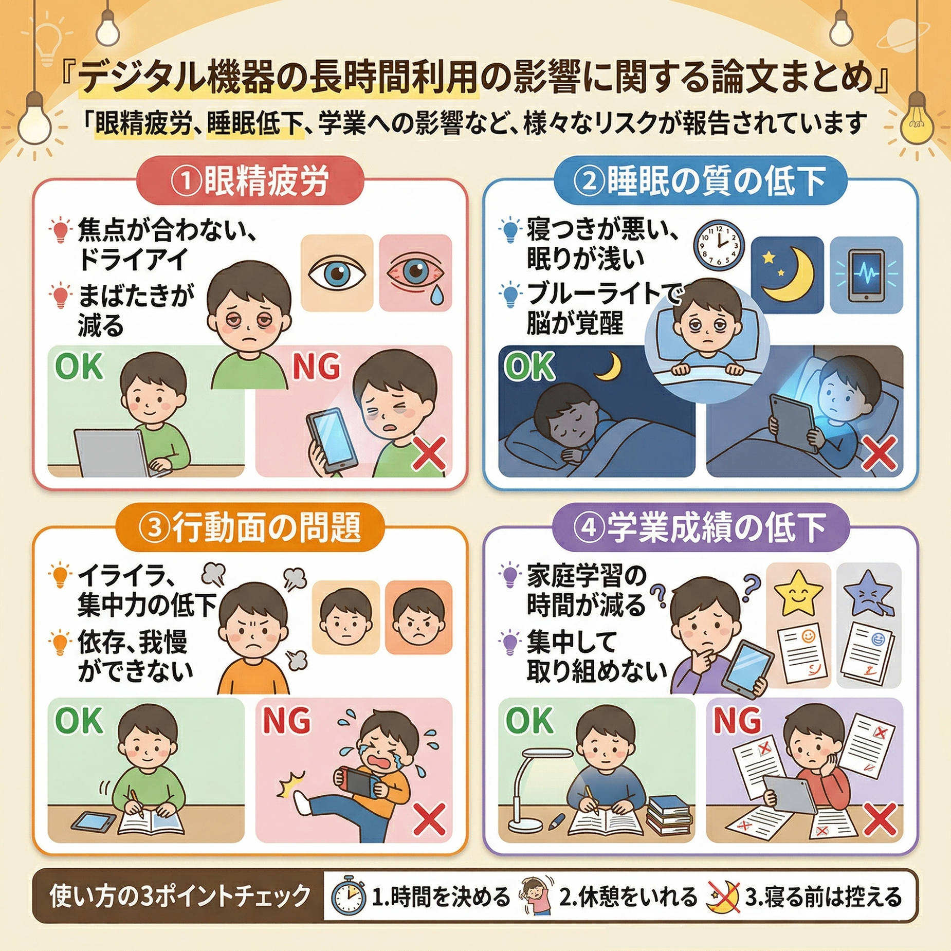 「顔が近い」「途中でダレる」「まぶしそうにする」。タブレット学習を見ていると、こうした変化が気になることがあります。けれども、それは単なる“やる気”の問題ではないかもしれません。 文部科学省は、ICT端末を使うときに、よい姿勢を保ち、目と画面との距離を30cm以上離すこと、少なくとも30分に1回は20秒以上画面から目を離して遠くを見ること、さらに画面の反射や映り込みを抑えることを重要なポイントとして示しています。日本眼科医会も、子どもの目を守る基本として、同じく「30cm以上」「30分で20秒以上遠くを見る」ことを勧めています(※1※2※3)。 デジタル機器の長時間利用についてまとめた論文では、眼精疲労、睡眠の質の低下、行動面の問題、学業成績の低下などとの関連がまとめられています(※4)。